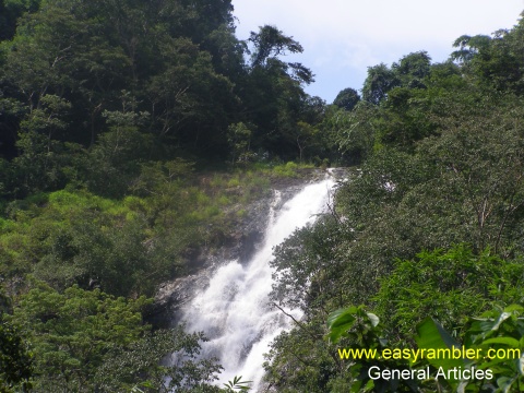 An outdoor scene with a hand held digital camera, in the Auto mode. A digital photograph where a tripod could have helped better the image composition and quality. Suggestion would be to use a tripod, switch to manual mode, set the aperture to the highest number (smallest size) and provide a slow shutter speed (longer exposure). The water would come like a smooth flow, almost like fine powder sailing from the hills. The background would remain in focus due to the tripod. However, this might not work out on a windy day when the trees and leaves are moving around.