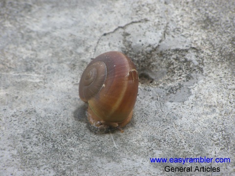 A snail about 3 inches big crawling on an old cement bench, the scene at a national park. Notice how the sharpness on the snail is contrasted by a rather blurd background towards the edge of the photograph. This is as shot by the digital camera and no light or color adjustments were done. Stood about 4 feet from the object when imaging it, flash would not have affected much as daylight was sufficient.
