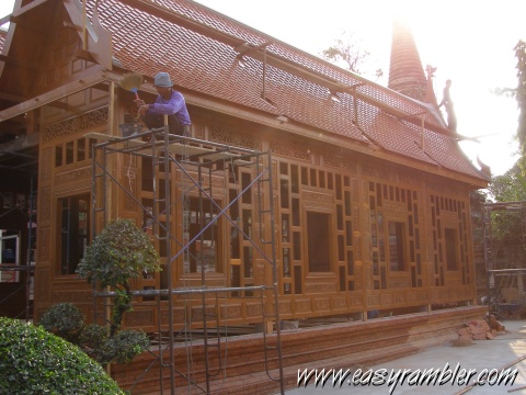 An intricately carved wooden structure being built. The angle at which this digital photograph was taken helped show that the entire house was made from carved wood. There was not enough space to walk back directly in front of the wooden house and take the photograph. Standing at a slight angle helped get the entire wooden house in the photorgaph.